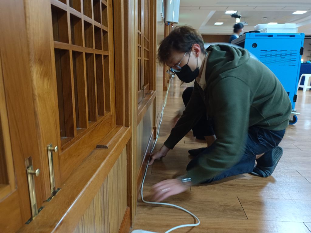 資訊處的同仁一同合力做好佈線工作,除了整齊外,最重要是讓行走安全。[攝影者:陳麗雪]
