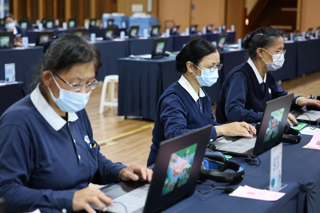筆電旁有耳機、滑鼠、滑鼠墊等多項電競配備,志工一一按照位置排列整齊。資訊組志工蔡謀誠,也邀約團隊做電腦硬體定位,再做軟體的歸零與電腦測試部分。他說:「因為這裏是一個考場,要非常慎重。軟體的測試之後,如果有問題,就必須更換電腦。明天早上還要再做最後一次的測試。」如此反覆地確認,就是希望達到最高規格的考試場域。