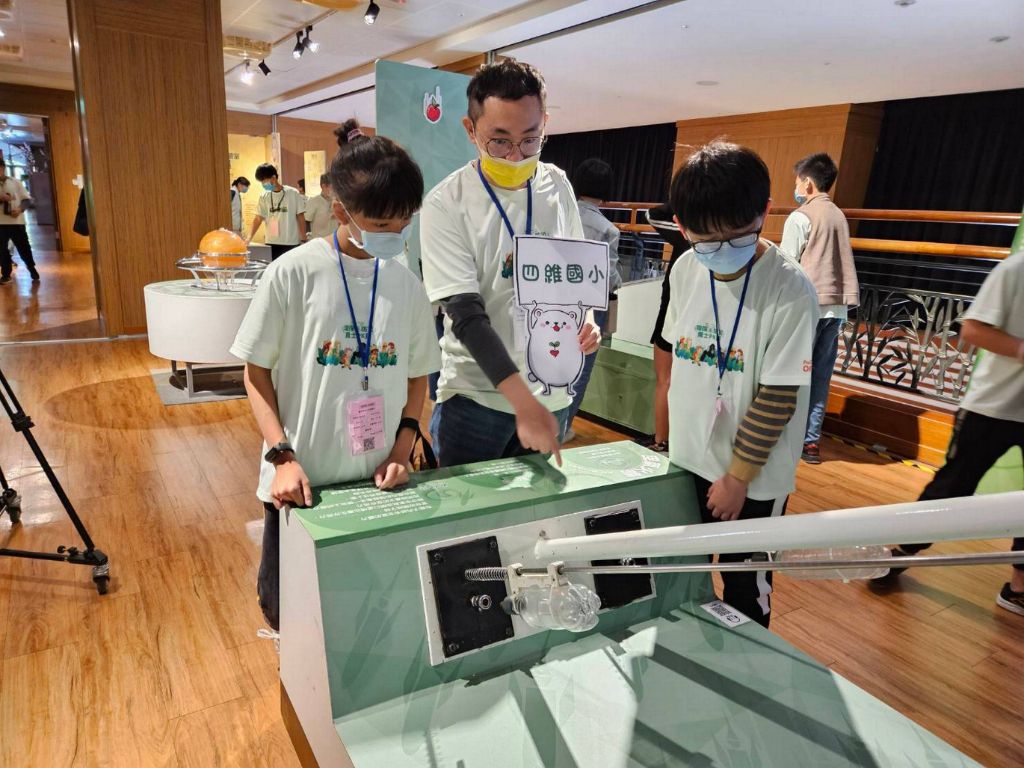 臺中市北屯區四維國小蔣忠勳老師(右),利用參賽空檔直陪伴學生到瘋狂科學家及環境教育場域巡禮,他不斷地引導學生了解科學與環保相關知識。[攝影者:林穎敏]