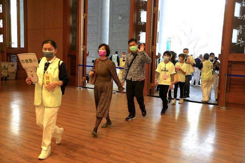 慈濟志工陳鳳娥(左一),引導臺中市北屯區四維國小團隊進入臺中靜思堂。校長黃翠琴(左二),帶領參賽學生參加臺中市盃環保防災PK賽。[攝影者:徐金生]