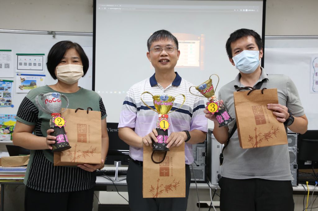 現場實體體驗前三名,第一名蘭潭國小學務主任龔聖傑老師(中)、垂楊國小胡月玉老師第二名(左)、北園國小白宗恩老師第三名(右)。[攝影者:王翠雲]