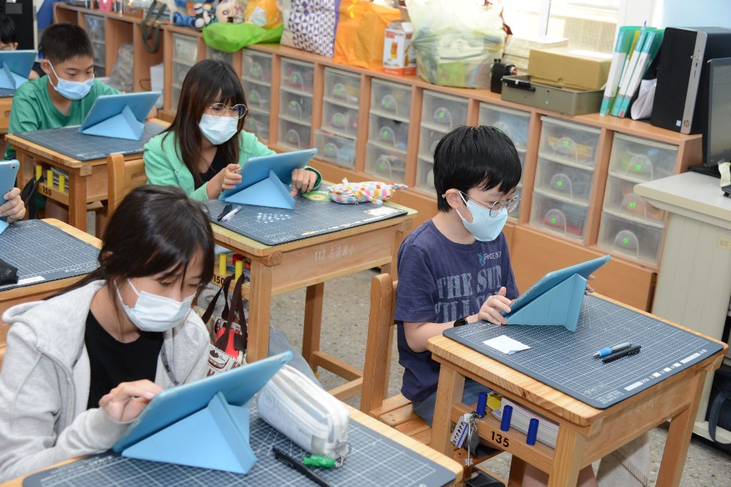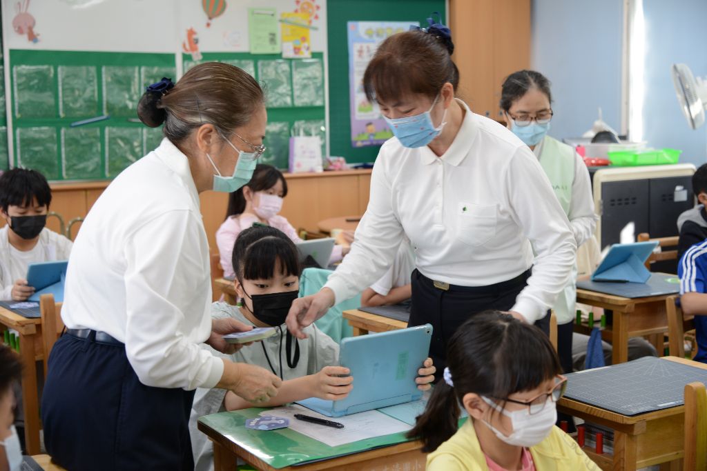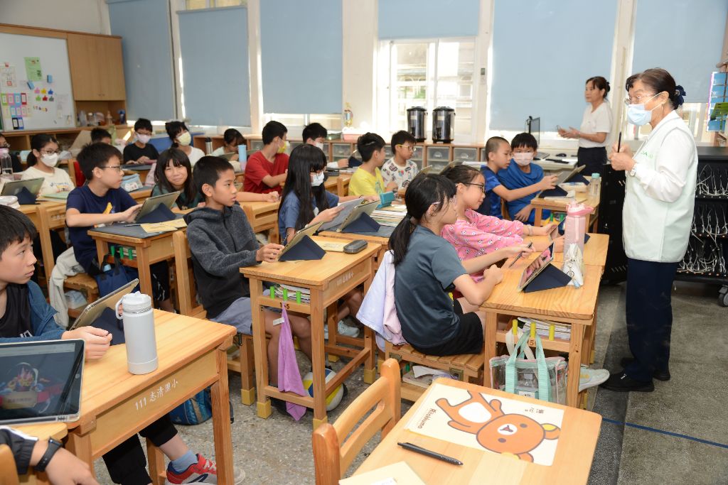 慈濟志工張垂壁 (右一)在六年三班教室承擔司儀串場講解PaGamO環保防災小勇士活動主軸。[攝影者:顏明輝]