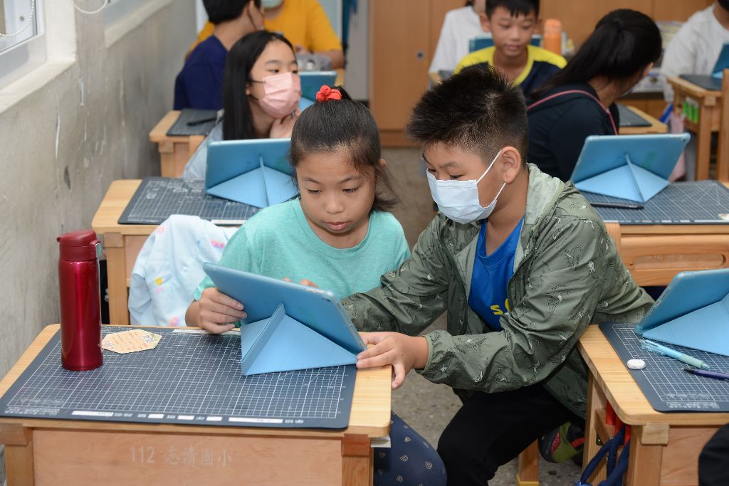 進入慈濟環保防災小勇士的地圖代碼、班級代碼,同學們彼此協助進入競賽之盾。[攝影者:顏明輝]