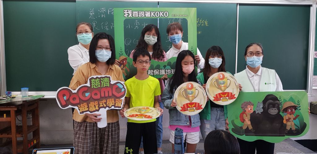 前三名頒獎後,六年五班曾明君老師叮嚀:「11月24號早上8點,要跟全校一起競賽 老師叮嚀不能遲到,否則會退競賽資格喔。」師生們和慈濟志工合影留念,為PaGamO班級競賽,留下見證環保護地球的決心。