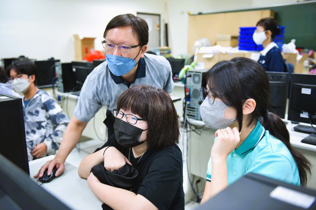電腦老師呂明吉(右三)協助參賽選手登入慈濟PaGamo的系統。[攝影者:李中瑞]