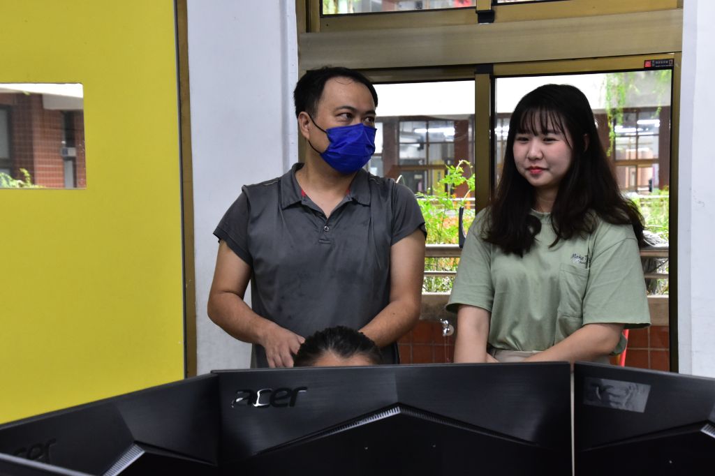 教務處胡倫茹主任(右一)覺得慈濟環保防災電競遊戲融入環保、防災翻轉學習方式,讓孩子在遊戲中自主學習,拓展知識領域,快樂學習環保防災知識。[攝影者:黃德祥]