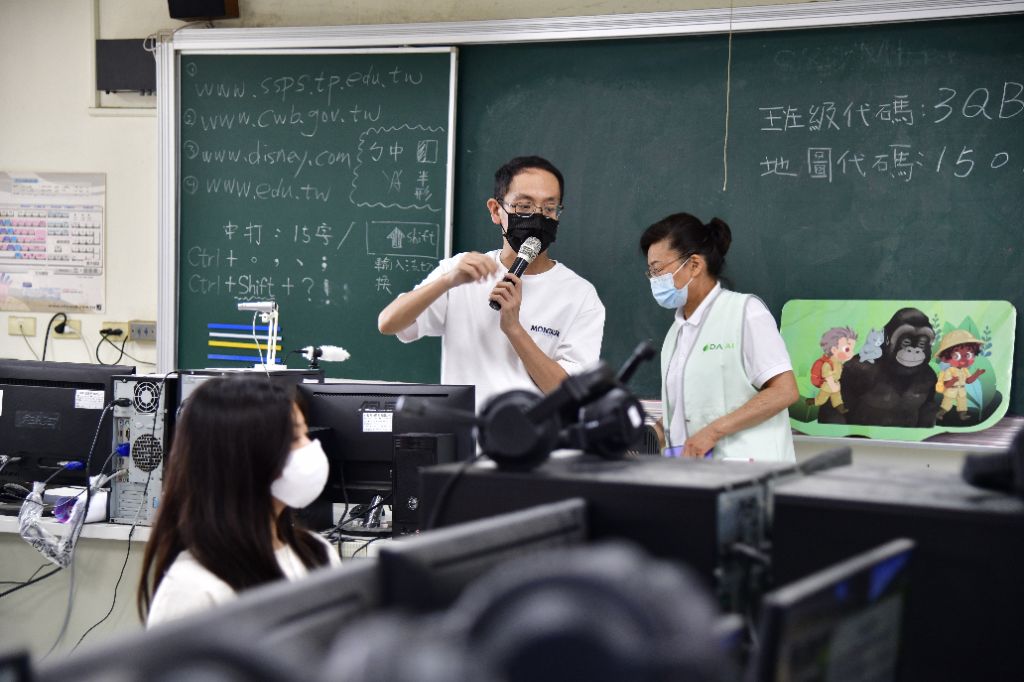 連續三年協助志工推動環保教育,蔡孟凡老師(左)盛讚今年參賽的學生成績優異,校內賽前七名都高達六百分以上。[攝影者:宋岱淳]
