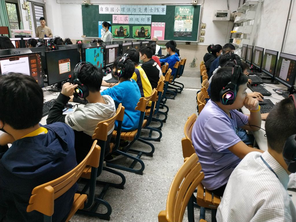 PaGamO 環保防災勇士PK賽校內盃複賽,共三十三位學生分兩間電腦教室同時比賽,人人手眼腦並用,安靜專注在電腦螢幕,鴉雀無聲專心作答,要一關過一關得高分。[攝影者:林文質]
