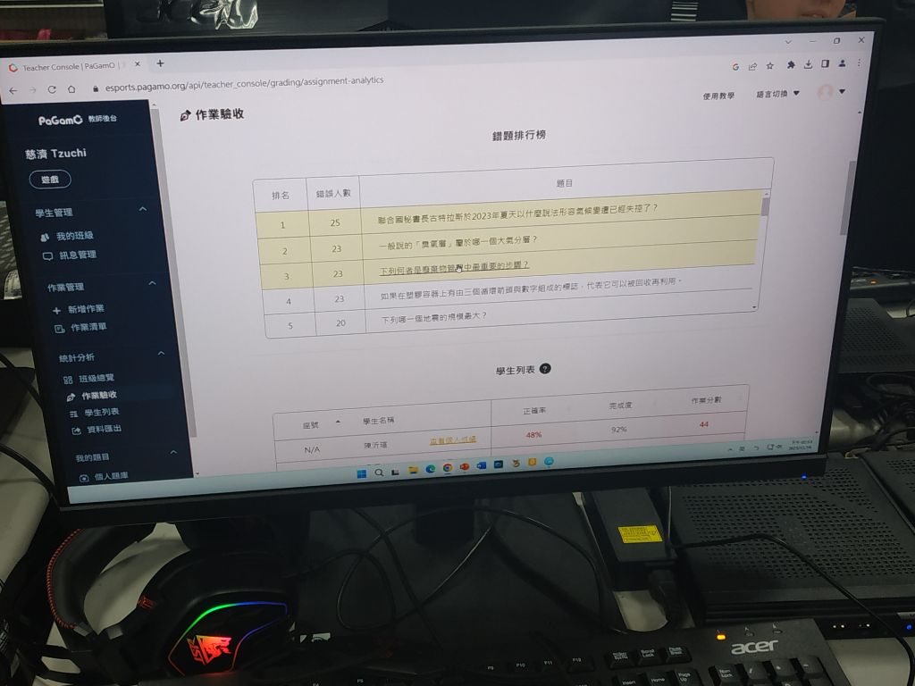 各班有提早一週讓學生跑流程,進入以後,先依照慈濟之前給的題庫練習大概半節課到一節課,增加問答或是題庫的熟悉度,也會影響到他們的成績。何老師覺得因為遊戲,「你進去可能有興趣,想要更高分的人,自己回家就再多加練習,我覺得分數比較多的原因,可能是這樣。」 而PaGamO平臺用遊戲來介入,讓環保議題提升學生們的動機,這也是學習上蠻好的策略。
