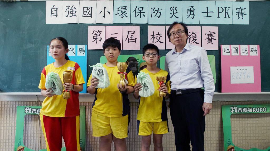 經過十五分鐘緊張激烈的競賽,校內盃冠、亞、季軍產生了!第三屆成績比前兩屆分數高,前三名都有八百多分,他們也是環保防災小達人,由校長頒發福袋獎品獎勵。[攝影者:林文質]
