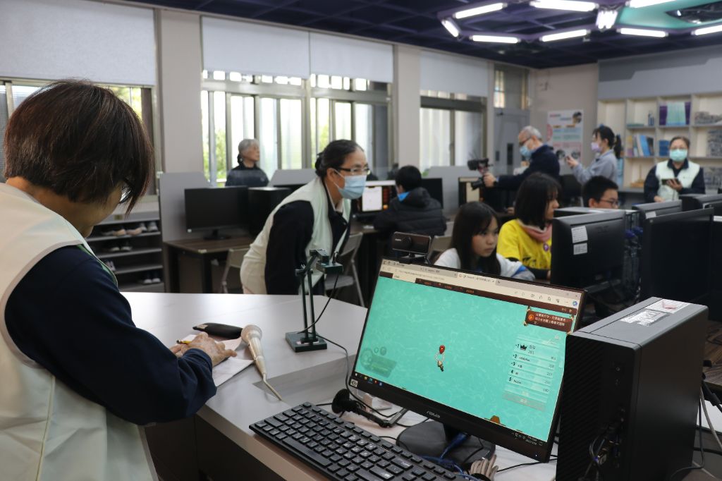 志工柯宏英(左二)呼喊:「go go go 最高八百多分!」隨著五位同學競逐緊張的氛圍,電腦銀幕帳號化名也不斷更迭起伏著。…[攝影者:賴麗惠]