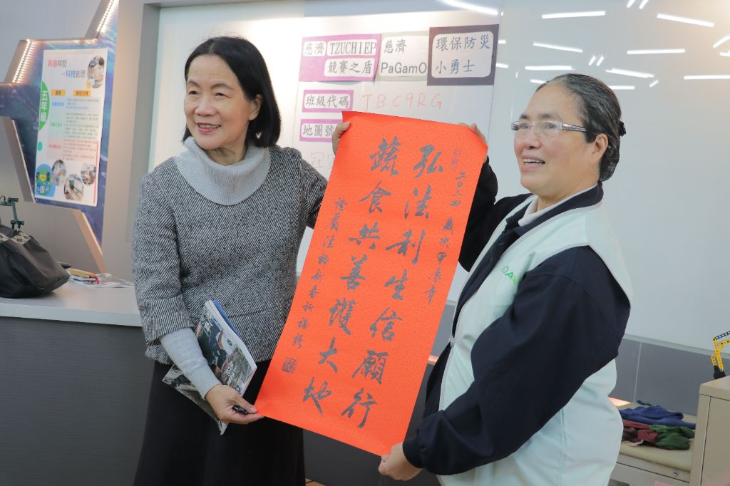 志工柯宏英(左)代表慈濟致贈春聯靜思語:「弘法利生信願行 蔬食共善護大地」,感恩校長林碧雲為教育的貢獻與付出。[攝影者:賴麗惠]