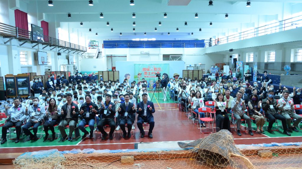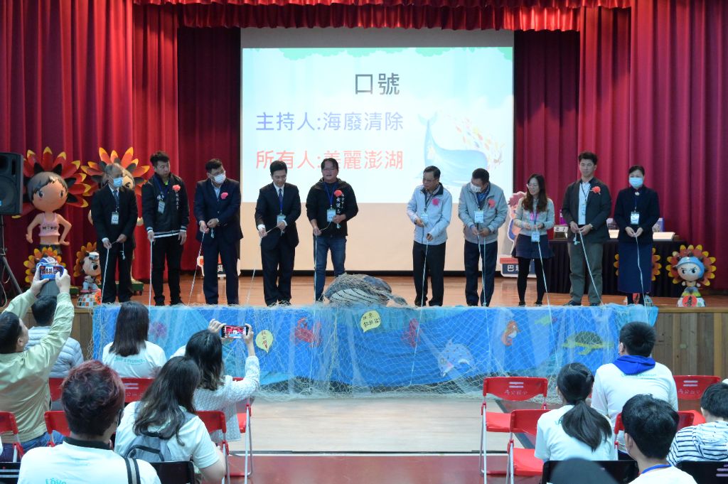 「海廢清除,美麗澎湖!」縣政府團隊和王運敬主任、澎湖志工代表蔡有仁、趙秀盈,一起拉開由興仁國小陳上元老師所設計的「網開一面」主視覺。由於人類在撈捕時,會用到各式各樣的漁網,當漁網斷裂或被棄置時,這些漂流於大海的漁網,就會成為海洋生物的殺手。陳上元老師希望透過設計,喚起更多人關注這些「管不住的漁網」,加強清理海廢,更不要過度捕撈,趕盡殺絕。