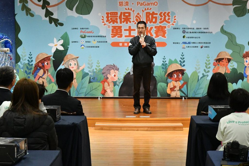 「我們都知道全世界在氣候行動,氣候變遷的議題上已經做了很多的努力。今天小朋友能夠齊聚一堂,參加環保以及防災的遊戲PK賽,最重要的意義是希望小朋友透過競賽的方式,可以學會很多防災、環保、健康的知識。」苗栗縣大山國小徐慶宏校長分享電競PK賽的意義和重要性。