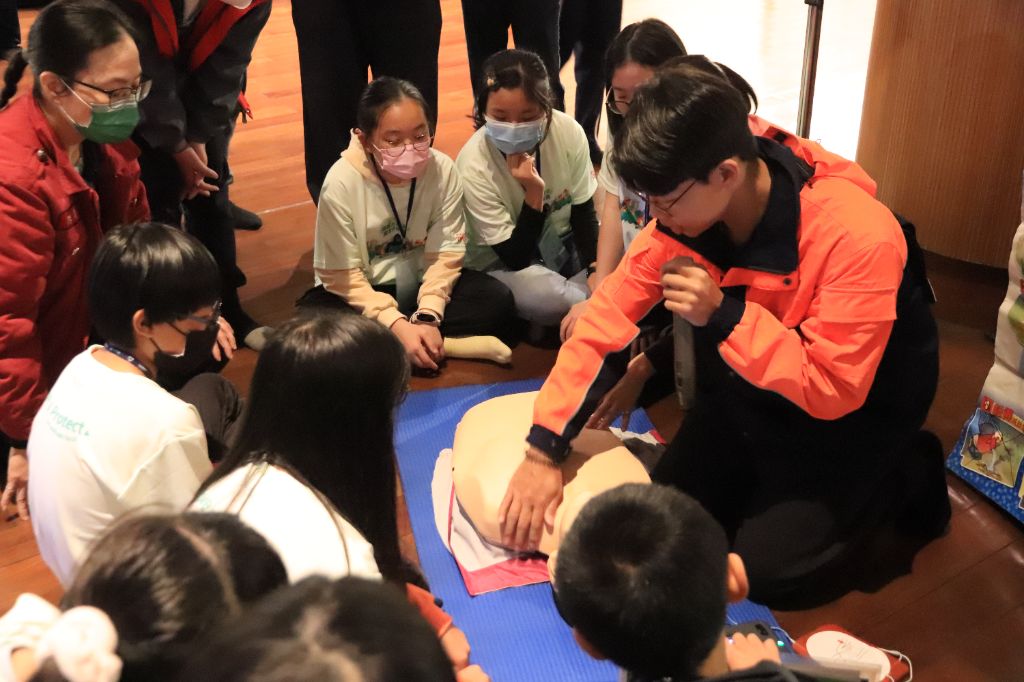 場外,消防局設的攤位,消防人員為學童示範、解說CPR的施作方法。[攝影者:曾漢儀]