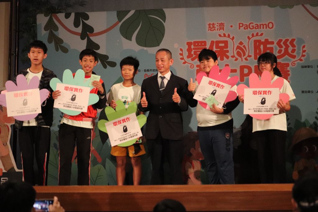 環保實作獎是今年新增的獎項,志工陳國政(右三)頒發此獎項給中獎的小朋友。[攝影者:曾漢儀]
