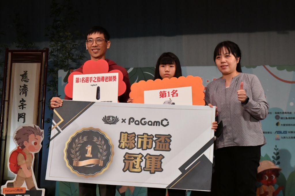 彰化縣盃環保防災勇士競賽結果出爐,獲得第一名的是和東國小林家綺,帶隊老師也上臺一起合影。[攝影者:楊文道]