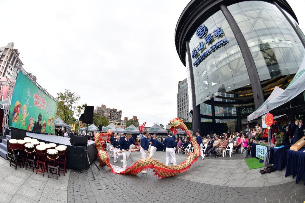 舞臺表演和嘉年華攤位也於松山車站前廣場同步進行,舞臺表演有舞龍、打擊樂團、擂鼓、歡樂年華舞蹈、傳統童玩-打陀螺、扯鈴、街舞,表演節目來賓由學校、民間團體和慈濟志工擔綱。[攝影者:蔡麗瑜]