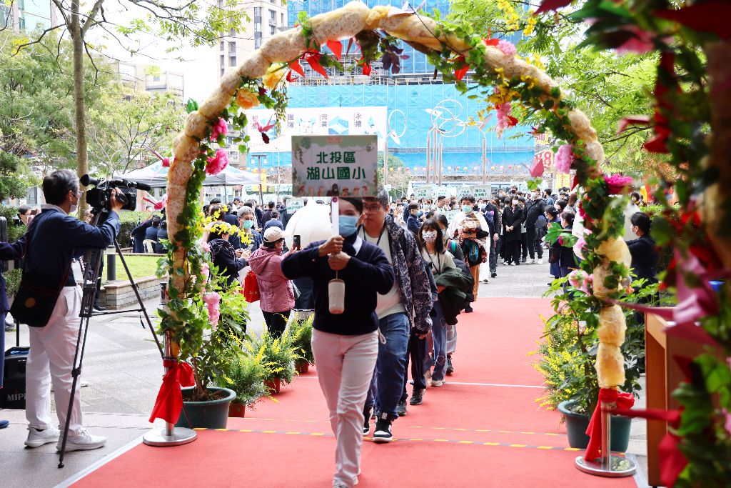 參賽學校的帶隊老師陪伴競賽勇士們,走向大門口的紅地毯星光大道,並進行團體照拍攝。承擔星光大道主持人逸仙國小校長陳曉慧、中正國中校長林泰安一一地介紹各校特色及團隊。[攝影者:郭淑靜]