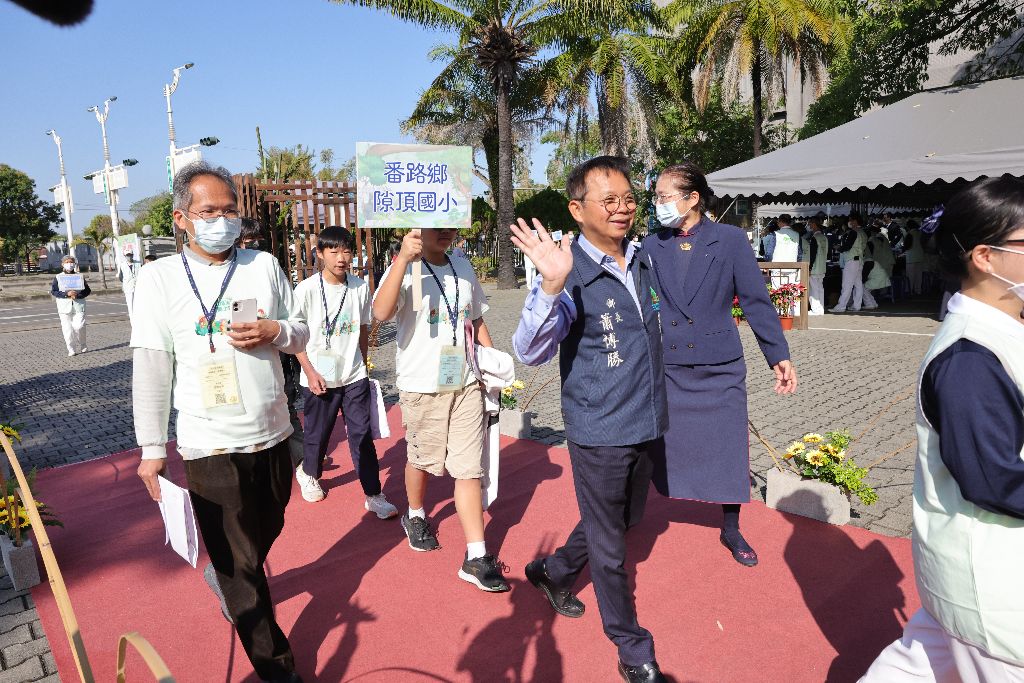 番路鄉鄉長蕭博勝(揮手)贊同慈濟教育理念,從小培養學生了解環保與防災,怎麼廢物利用增加它的價值。[攝影者:黃武添]