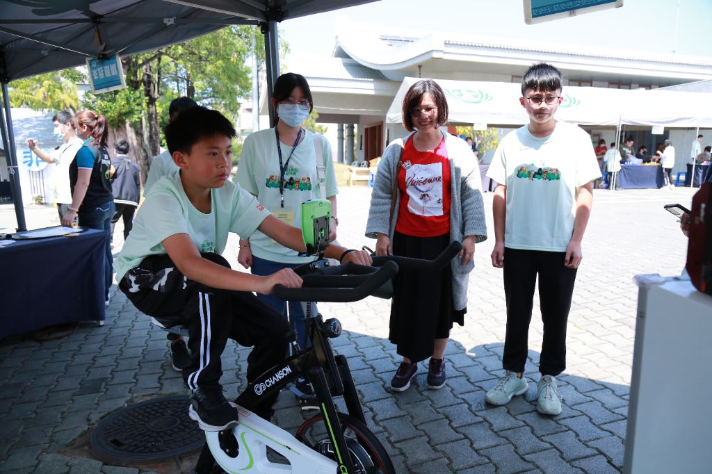 「加油……方向對了,衝!衝!衝!四格了,加油!」在「NEED FOR ESD」腳踏車充電攤位前加油聲不斷,陳品諺用力踩著腳踏車發電,體悟可以用運動環保的方式去發電。他說,「減少二氧化的排放,降低溫室效應,阻止臭氧層越破越大,冰山不會融化那麼快。」腳踏車踏久腳也會酸,同時也讓小朋友體會平常吹冷氣、看電視等用越多的電,就要消耗更多的力量,所以要節約能源,避免浪費地球資源製造汙染。