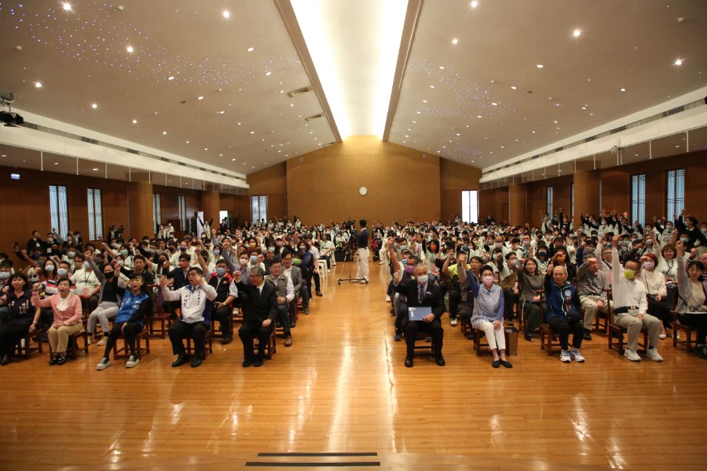 開幕儀式中,在佛堂現場的師生、貴賓、慈濟基金會同仁,透過螢幕與第二現場的家長揮手,近四百人一同參與這場盛會。[攝影者:洪銘輝]