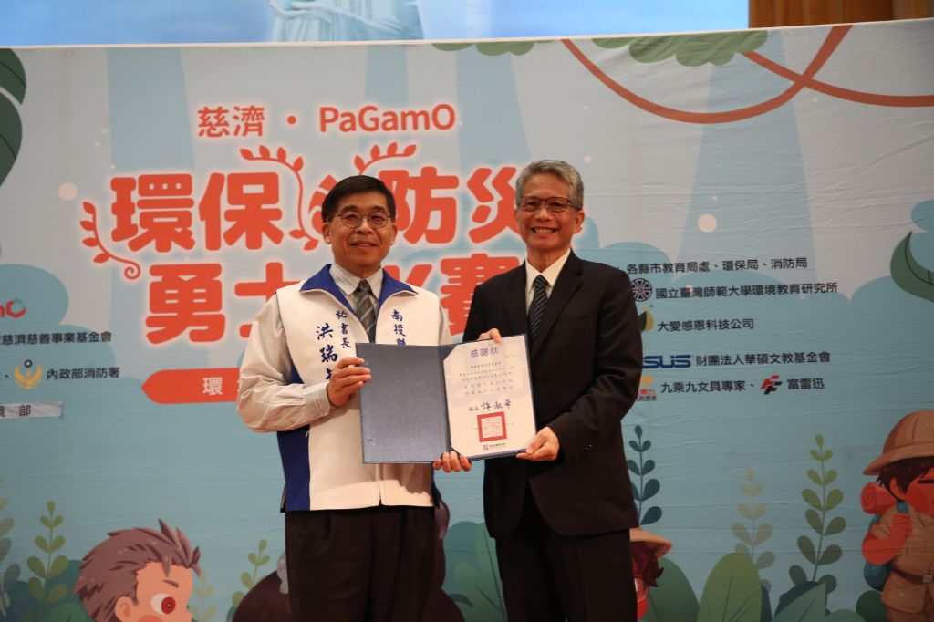 南投縣政府洪瑞智秘書長(左)代表南投縣政府致贈慈濟慈善基金會感謝狀,贊助縣府合辦此次競賽,由慈濟慈善基金會熊士民副執行長代表接受。[攝影者:洪銘輝]