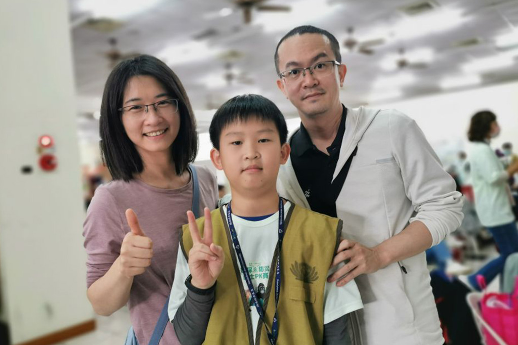 光華國小選手黃庭佑(中)的父母來為孩子加油。家長黃森壕(右)感謝慈濟舉辦這樣的活動,提升孩子的環保知識與落實環保的興趣,這是單靠家長很難做到的。[攝影者:張秋菊]