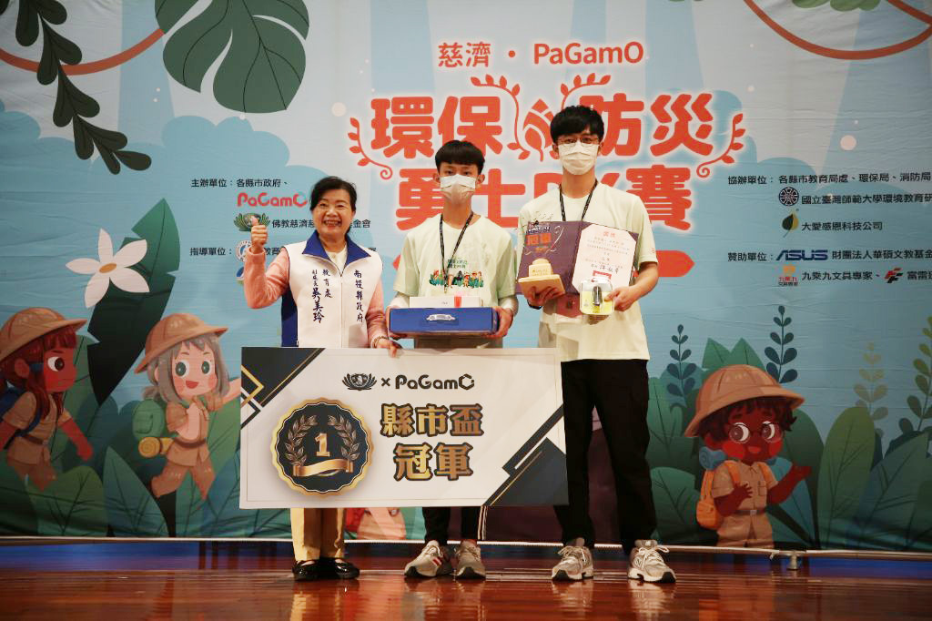 第三屆「慈濟x PaGamO南投縣縣市盃環保防災勇士PK賽 」,在慈濟南投聯絡處舉行,由南投國小林大鈞勇奪冠軍,與指導老師楊子頡(右)上臺領獎,獲得全場熱烈掌聲。[攝影者:洪銘輝]
