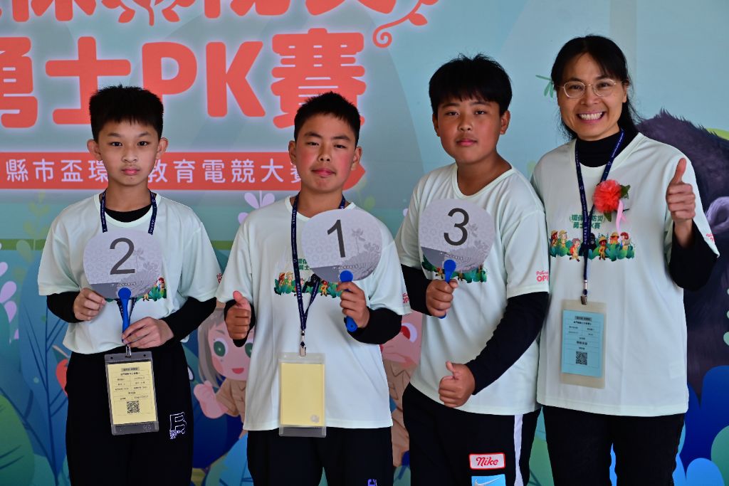 金城鎮古城國小包辦前三名:第一名董津榕、第二名陳柏諭、第三名石尚,帶隊的陳美慧老師(右)居功厥偉。[攝影者:鄭村池]