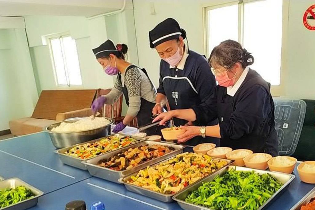 金門香積窗口董鳳英(中)帶領團隊從15日到17日三天,為工作人員準備了三百五十個左右的餐盒和茶水。[攝影者:李姿縈]