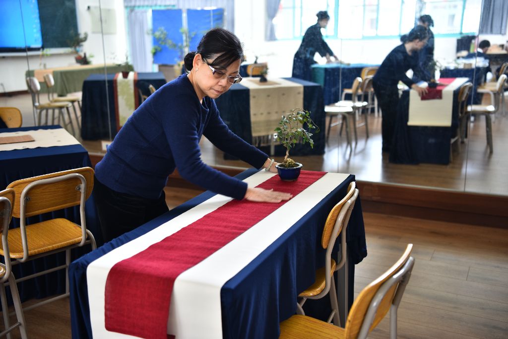 大安區志工林欣璇是烈嶼(小金門)人,特地回到金門支援溫馨會談的場布和接待貴賓。她邀約有十幾年接待經驗的北區志工洪秀緞前來參與。林欣璇說:「事前知道,金門場布的資源不足,所以從臺北帶了長桌巾和茶席的用品來,以茶道的規格將會場布置得具有慈濟人文,給貴賓溫馨的感覺。」金門志工董兆寶也從家裡搬來大大小小盆栽擺設,為整個座談會場增添許多綠意。