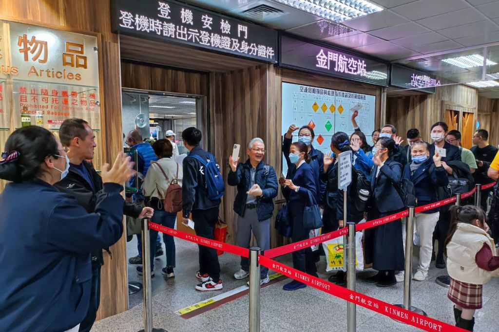 18日傍晚終於候補到機位準備登機。歡喜和前來陪伴的金門志工李威(左二)、洪薌瑾(左一)揮手道別,彼此相約後會有期。[攝影者:吳信立]