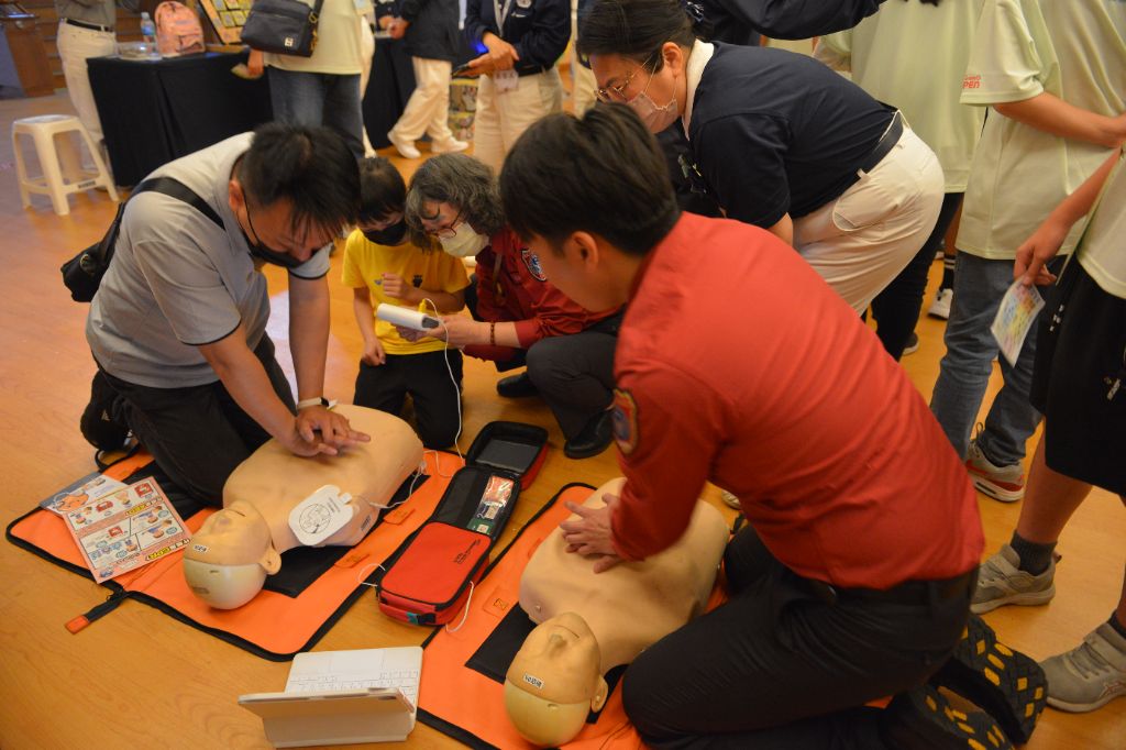 「心肺復甦術區」,家長楊鈞銘聽從消防員指令,按CPR 的操作步驟 • 1.確認現場安全,2.叫--評估意識、呼吸,3.叫--呼叫求援、打119報案,4.壓--胸外按壓,5.電--使用電擊器(AED)。「叫喚確認意識,叫救護車,繼續按壓胸口……」努力學習之後,他分享:「遇到家人、朋友,或是有人有不舒服時,我也可以幫他急救!」