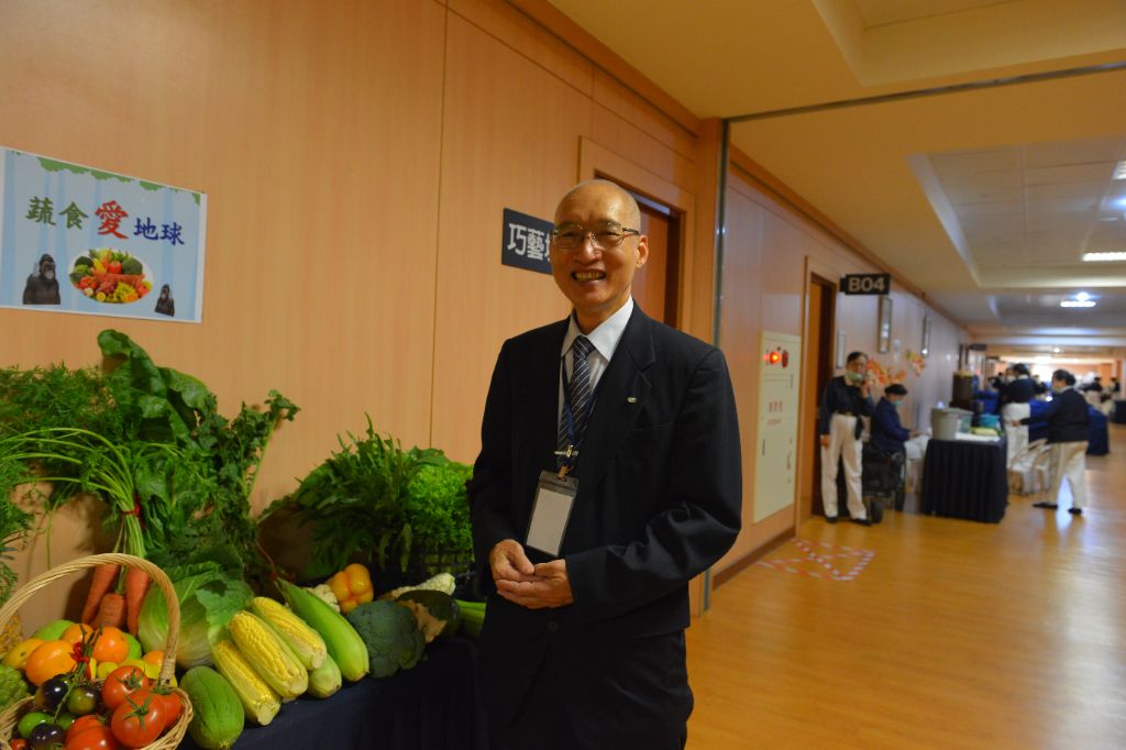 站長志工陳永釧、黃仁川詢問小朋友們:「這是什麼?開心農場種的紫色番茄、燈籠果……」接著說明友善環境的食物,蔬果種類比較多,吃蔬菜水果對人類健康有益、也友善大地。