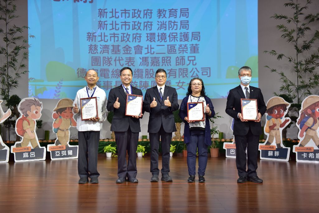 為感謝各單位的支持,共同圓滿這場電競賽事,慈濟基金會劉效成副執行長(中)感謝狀給環保局、消防局、教育局、慈濟基金會北二區榮董、德安公司後合影。[攝影者:余錦豪]