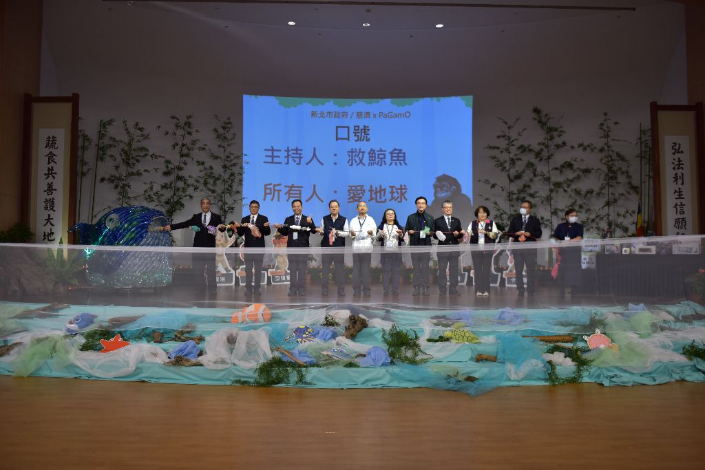 舞臺旁邊有一隻利用七百多支回收寶特瓶製作的大鯨魚,還有各種回收的塑膠物再製而成美麗繽紛的裝飾,代表著美麗的海洋世界,今天集結大家的力量,一起合力來清除大鯨魚肚子裡面的垃圾。主持人賴郁婷、陳清雅用力喊「救鯨魚」,全體大聲呼應「愛地球」;再齊聲呼籲「跟著KOKO」,響應「保護地球!」付諸環保防災愛地球行動。
