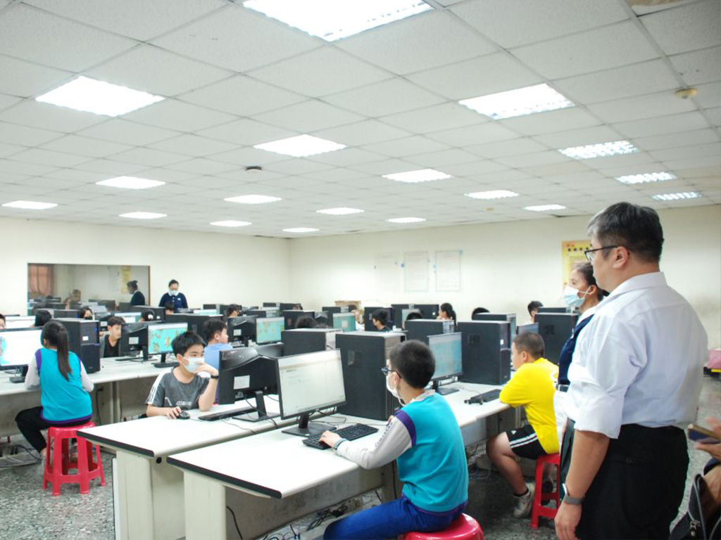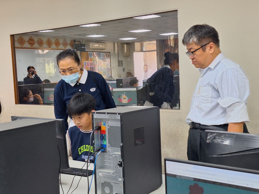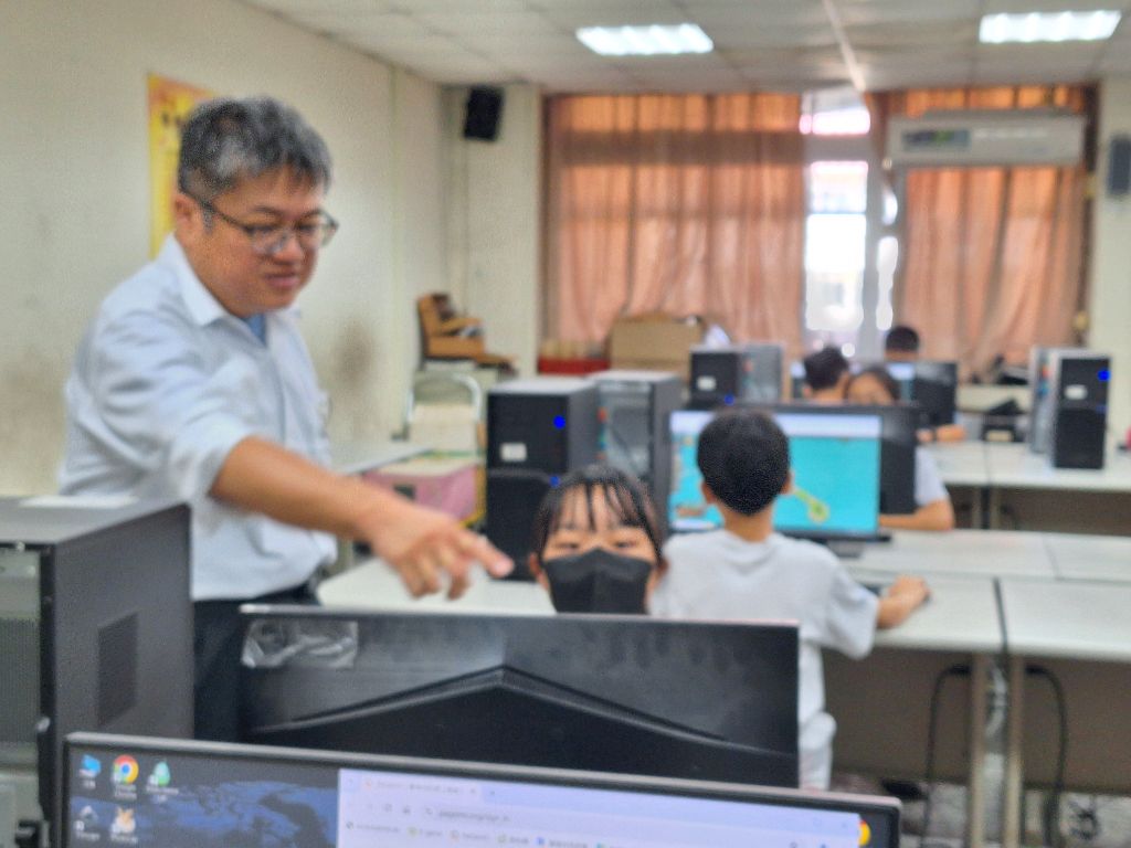 電腦老師涂俊文(左)認真巡查參賽者有無狀況,立即解圍,他表示:「很高興到目前家長都贊成小朋友參加,不會有反對的 ,學校方面當然會繼續結合遊戲跟學習的這種方式,希望更多小朋友來參與。」[攝影者:蔡鳳琴]