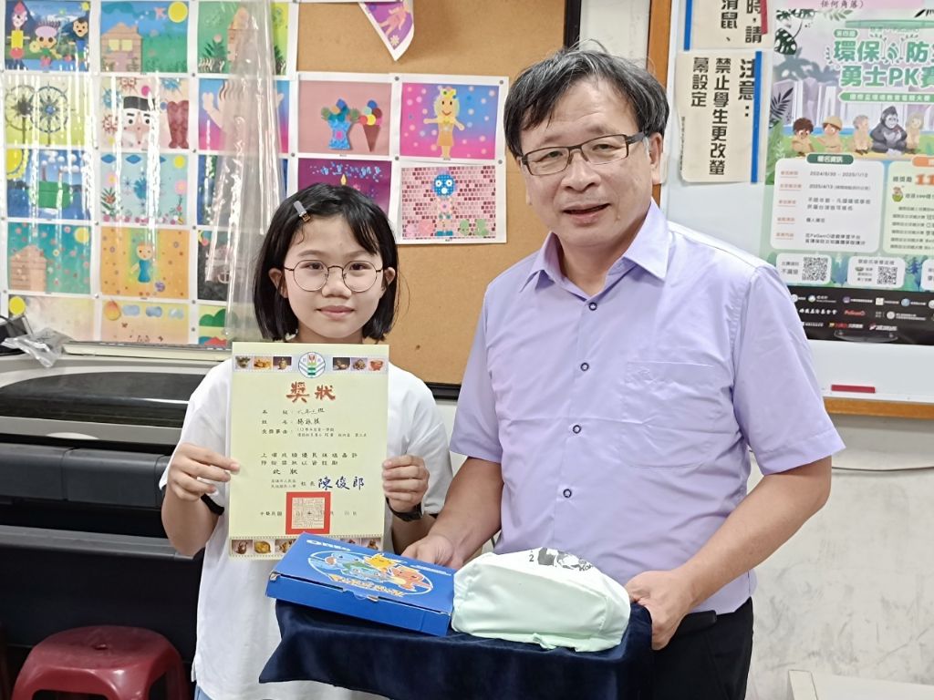 長的甜甜的第三名楊詠棋(左)與陳俊郎校長(右)歡喜合影,她說:「從PaGamO比賽中,學到了災害來臨的應對和防備措施。得到第三名可以代表學校去慈濟比賽很開心,我要感謝學校的老師、爸爸媽媽還有慈濟的師姑師伯。」[攝影者:蘇信惠]