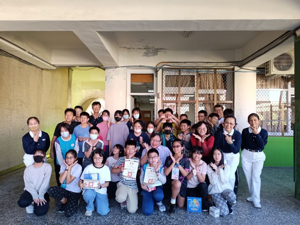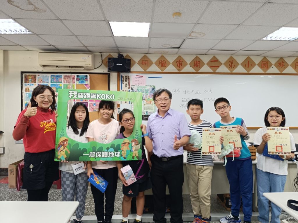前六名拿著「我要跟著koko一起保護地球」的環保刊板,很高興的跟校長合影,隨後全體參賽者與校長快樂留影,陳俊郎校長跟學生愛的鼓勵:「沒入選的人也可個人上網去報名(不分年紀的海選),像今年(113)鼎金國小用個人報名也得第一名。」
