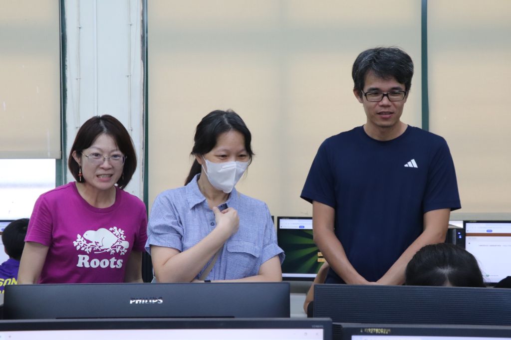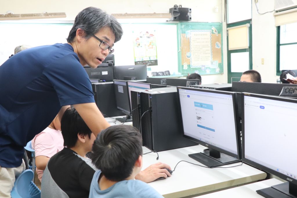2025年「環保 & 防災勇士PK賽」,9月30日,臺北市西松國小校內盃的比賽,電腦老師廖家瑜協助校內盃參賽同學進入比賽頁面。[攝影者:洪玉女]