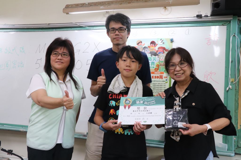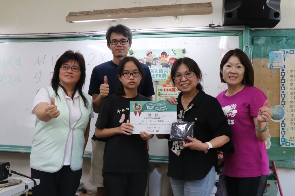 鼓勵同學關注環境保護議題,也透國競賽加強大家的環保意識,季軍周思辰(左三)同學與師長及志工合影。[攝影者:洪玉女]