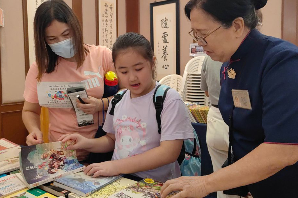 符明萍(左)陪著闖關成功的女兒,到書海閣選擇自己喜歡的二手書。[攝影者:饒于莉]