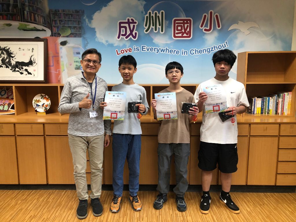 由右起:利校長、第一名楊佑霖、第二名劉秉叡、第三名林宸祐,三位同學將代表學校參加明年三月新北市盃競賽。[攝影者:陳姝月]