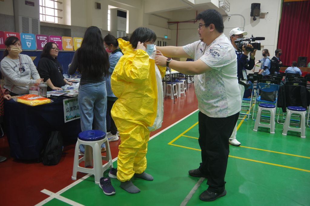 在緊張刺激的賽事場外,另設有多個宣導攤位。今年消防局設置防災宣導攤位,並提供豐富宣導品,讓師生與家長深入了解防災的重要性。家長帶著孩子一同闖關學習新知,樂趣無窮。消防員也準備防護衣供親子體驗,並分享救災經驗:在面對油品或化學藥劑引起的火災時,燃燒速度快、溫度高且伴隨大量濃煙,極具危險性,穿上防護衣能有效阻隔化學物質與高溫傷害,對消防員具有重要的保護作用。
