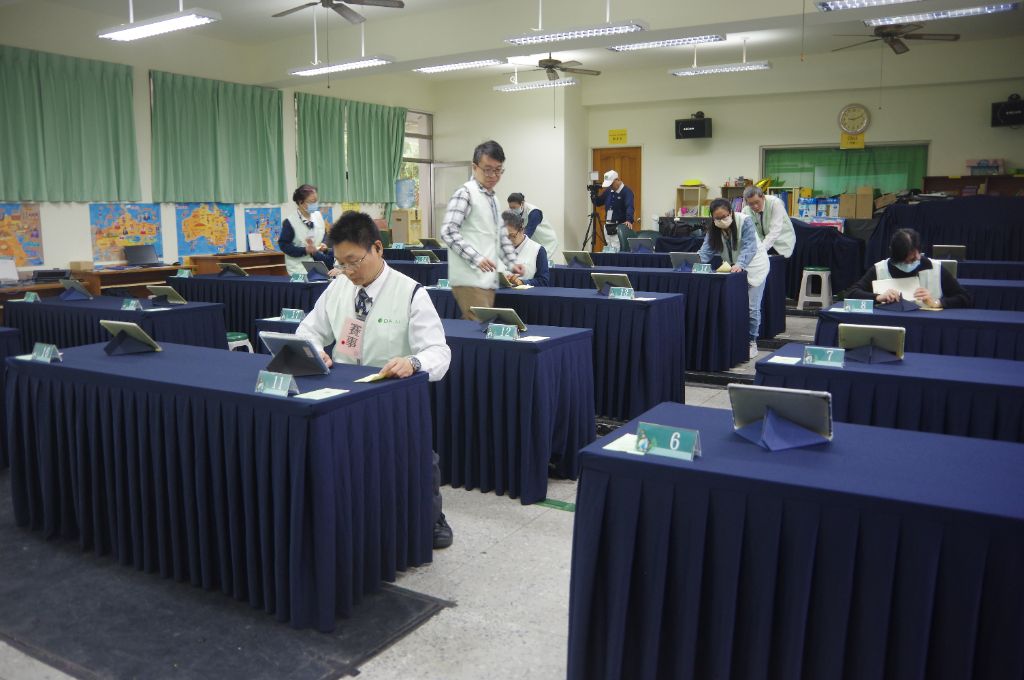 今年澎湖縣市盃xPaGamO的競賽第一次使用平板,賽事同仁認真檢查,一一確認電量是否充足、網路連線、螢幕亮度及音量調整、帳號事前登錄完成等重要事項。[攝影者:蔡秋對]