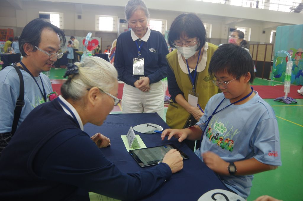 活動攤位中,來自湖西鄉成功國小的王天敏校長,正陪伴一位特殊生進行遊戲。王校長說:學校六年級僅有四位學生,其中就有兩位是特殊生,仍特地帶他們前來參賽。雖然是特殊生,但老師們親切地稱他們為「來自星星的孩子」。特殊生雖有個別差異,老師在教學上始終用心且充滿耐心,理解並陪伴這些星星寶貝,期盼他們能在寓教於樂中學習新知、快樂成長。