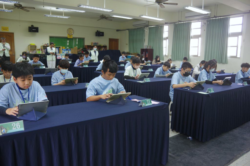 比賽分為 A、B、C 三組進行,依成績排序後進入總決賽。志工引導同學前往比賽教室,參賽學生依序入場就位,專心聆聽比賽規則,準備迎接接下來的挑戰。賽場內秩序井然,選手神情專注,螢幕上的題目快速切換,不僅需要答題,還要攻城掠地,選手們沉著應對、全力爭取佳績。經過緊湊激烈的初賽後,進入最後的總決賽。比賽結束後,檢錄組仔細統計成績,成績優異的前十位同學在志工協助下完成相關資料登錄。