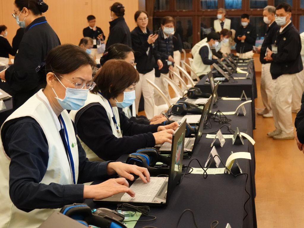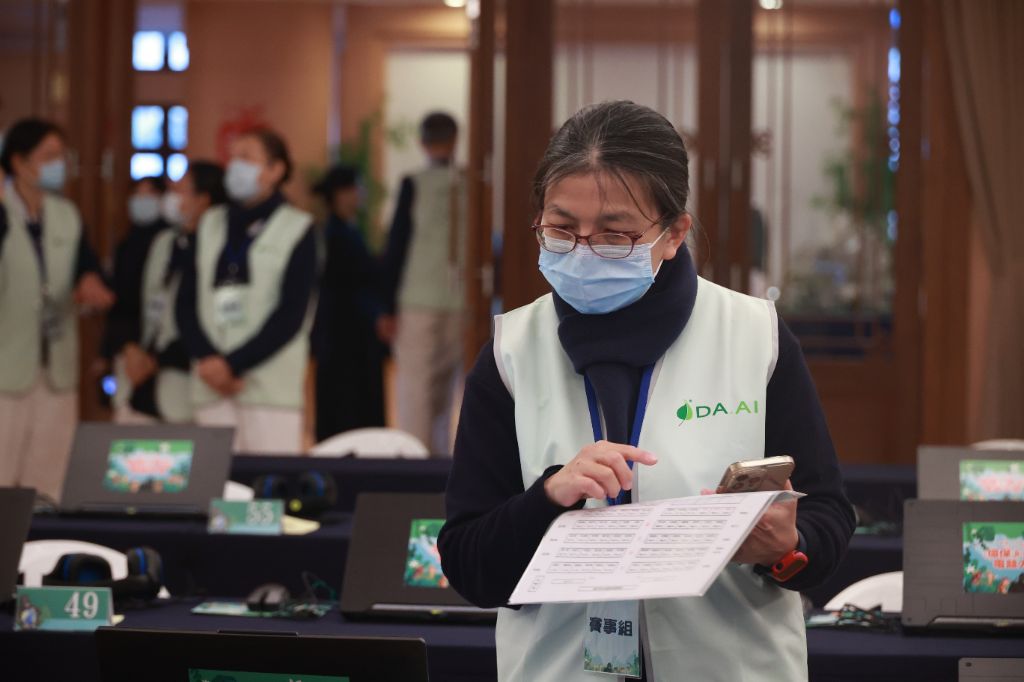 早上九點過後,在一樓國際會議廳賽事組做最後比賽資材的確定。志工們一一查看參賽選手名字是否正確,電腦運轉是否順暢等等,並祈禱今日活動順暢無礙。[攝影者:張泰元]