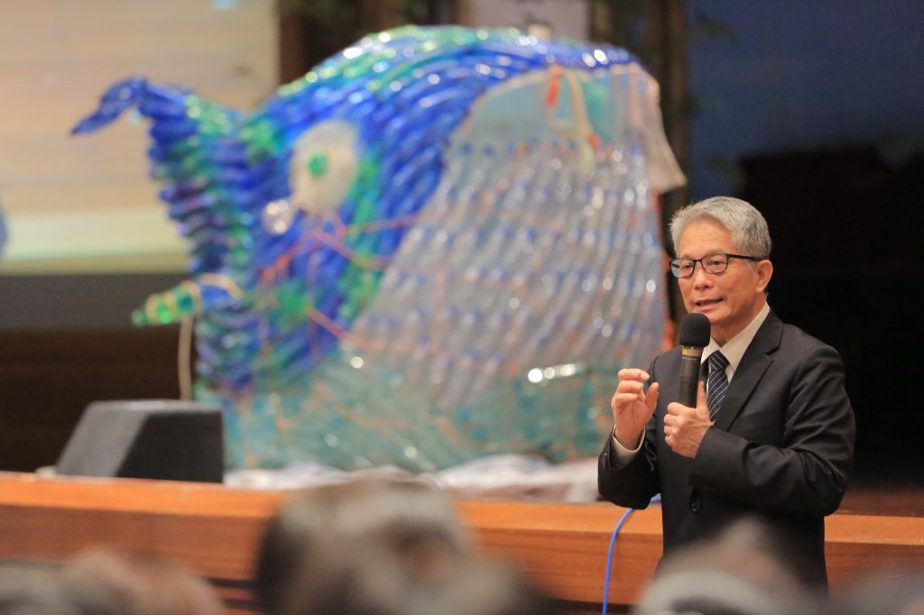 感恩會座談中,來自埔心太平國小的鄭權鑫校長,分享自己與慈濟的故事,及學校環保的推動。鄭校長期盼,更多學校與師生共同投入,讓守護地球的力量不斷延續。[攝影者:吳明土]